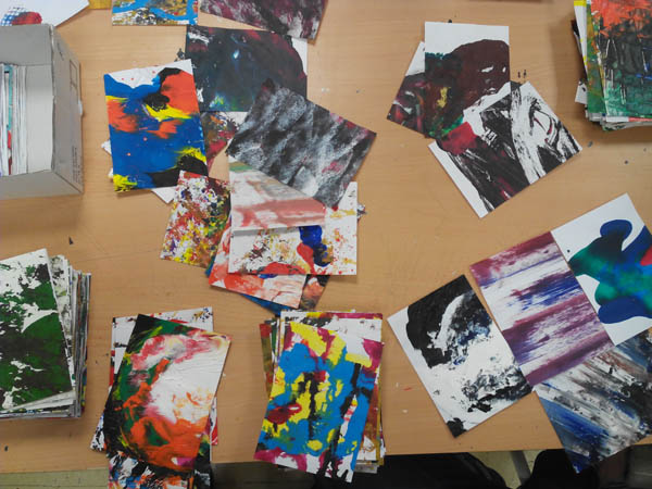 en el centro de esta mesa hay una caja con más de 1.000 DIN A5 con pinturas en acrílico y otras técnicas, uno de los pilares de la creatividad reside en el trabajo.Poco a poco vamos haciendo una selección pensando en la obra de gerhard richter y la ubicación final, vamos ha realizar una pintura mural