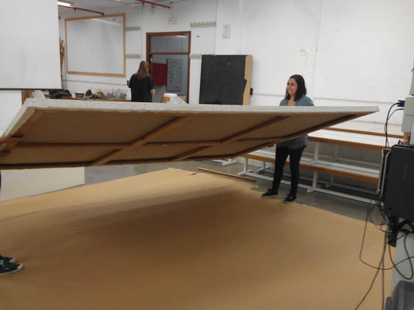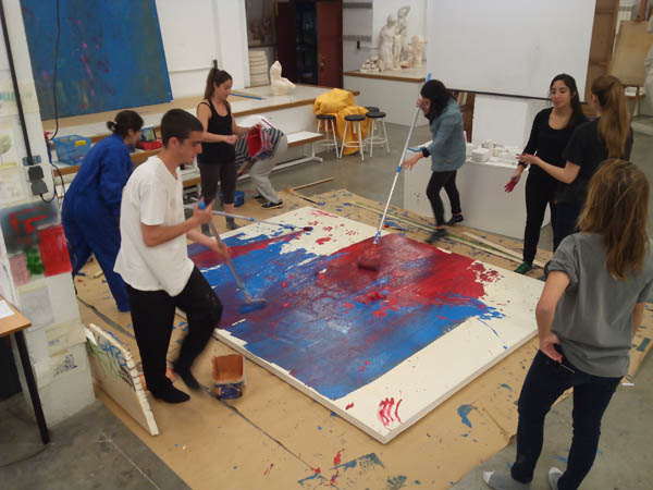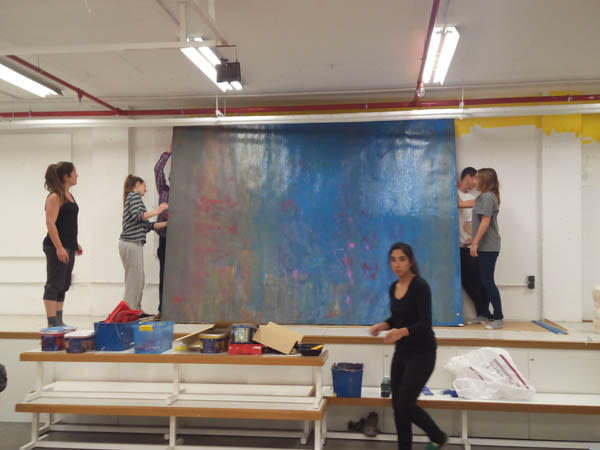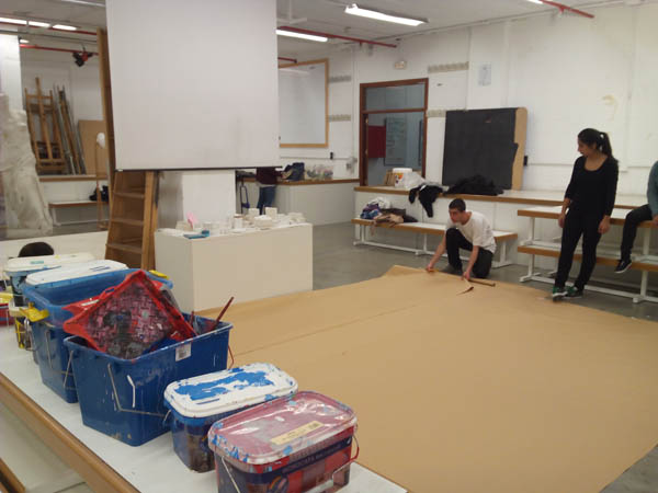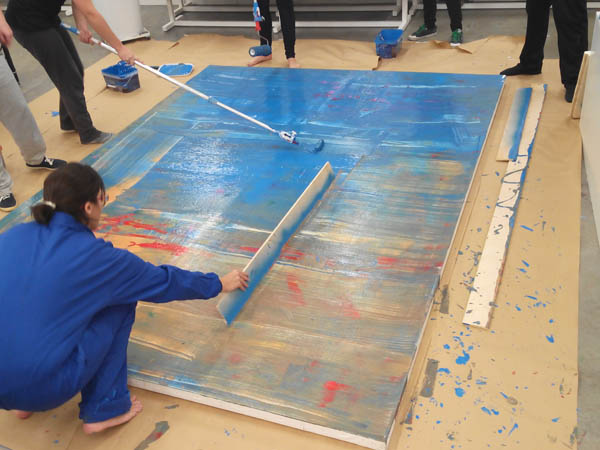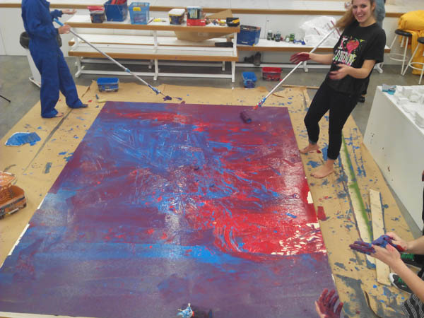 con todo esto hemos cogido la pintura las rasquetas y los lienzos y nos hemos trasladado a otro aula a empezar con los fondos de estos murales.