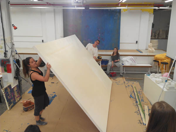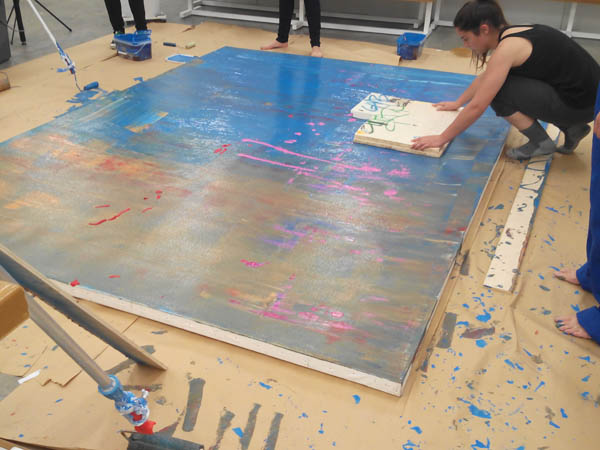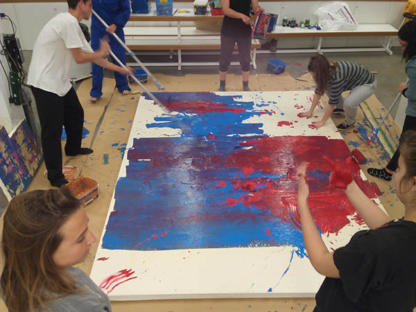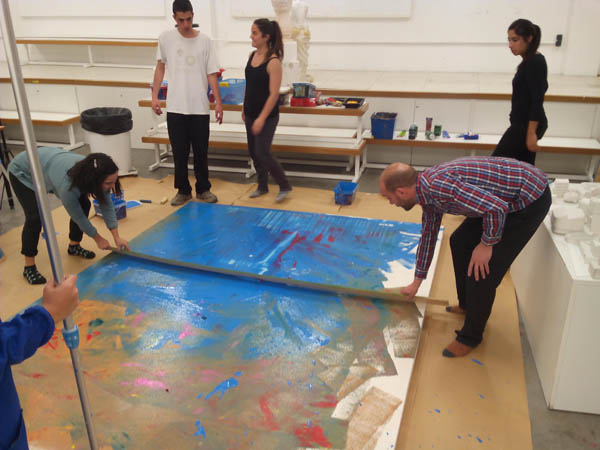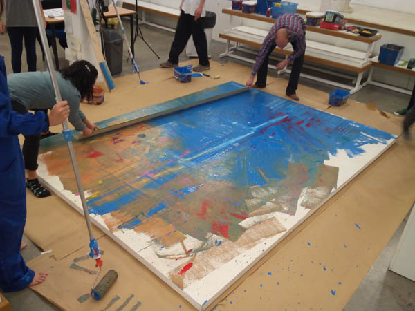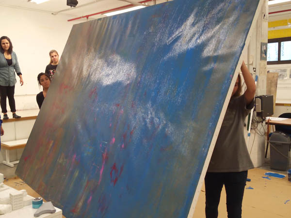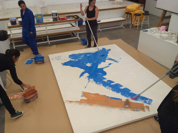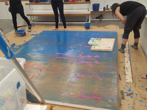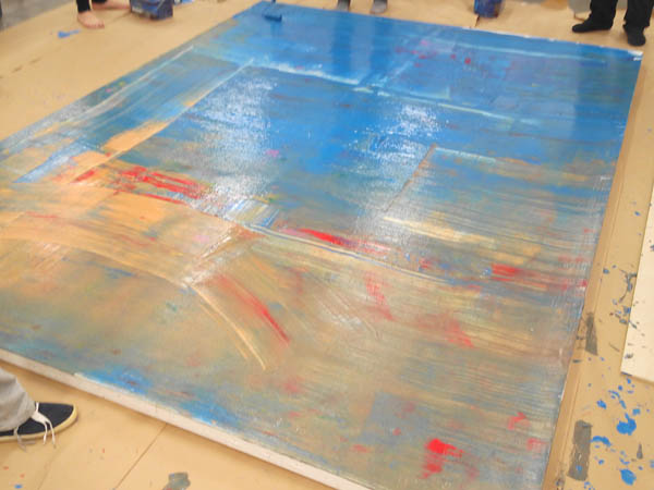 Llega el primer lienzo.cubriendo el fondo, los colores están «apagados» para que en días posteriores podamos trabajar con colores más saturados y diferenciar fondo de figura.rasqueta tipo gerhard richter en acción